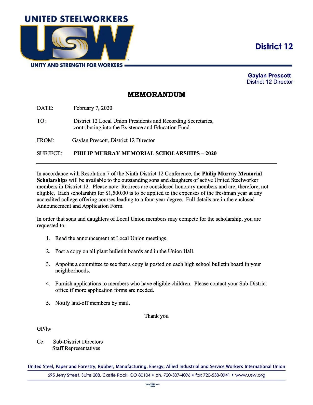 In accordance with Resolution 7 of the Ninth District 12 Conference, the Philip Murray Memorial Scholarships will be available to the outstanding sons and daughters of active United Steelworker members in District 12. Please note: Retirees are considered honorary members and are, therefore, not eligible. Each scholarship for $1,500.00 is to be applied to the expenses of the freshman year at any accredited college offering courses leading to a four-year degree. Full details are in the enclosed Announcement and Application Form.